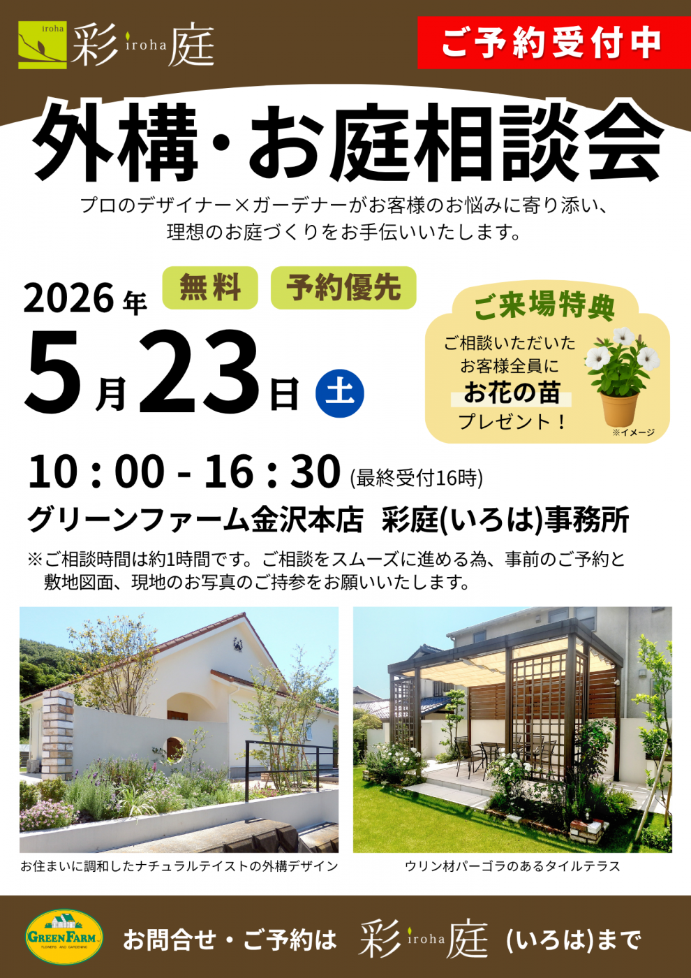 無料で外構やお庭の相談ができる機会となりますので、ぜひお気軽にご予約ください。
