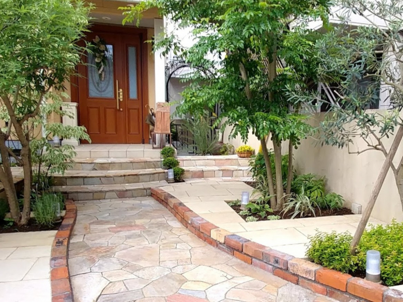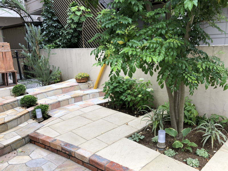 外構工事で間口を延長した階段には、切替部を自然に見せるため植栽スペースを作りマルツゲを植えました。