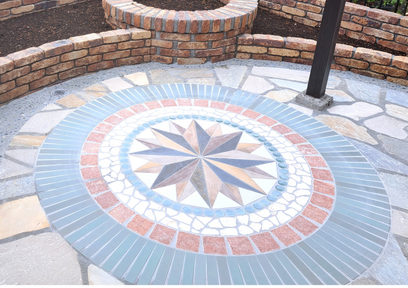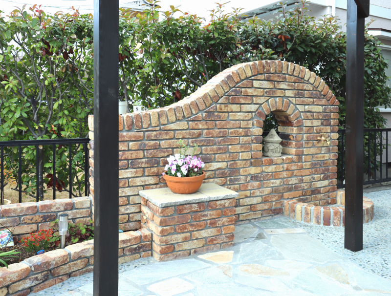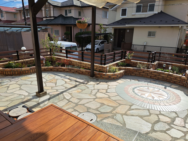 高さに変化をつけたレンガ花壇や川の流れの様な乱形石。