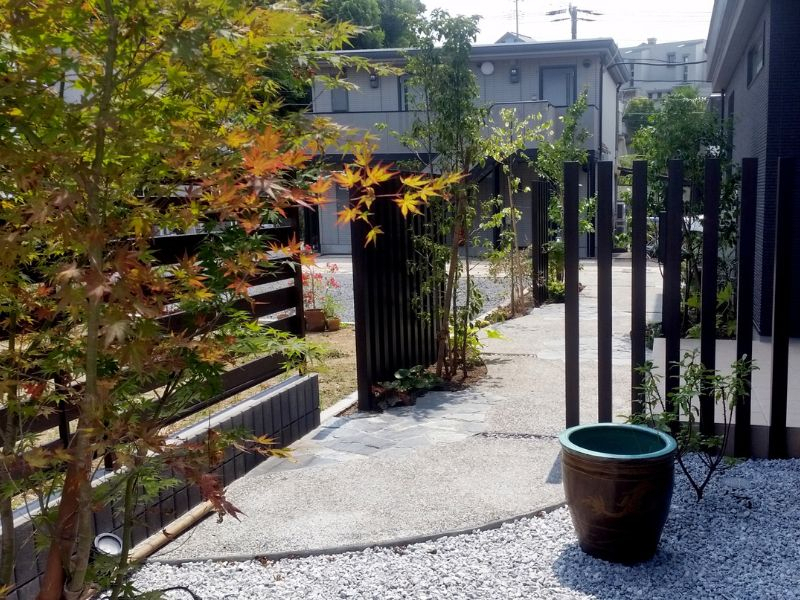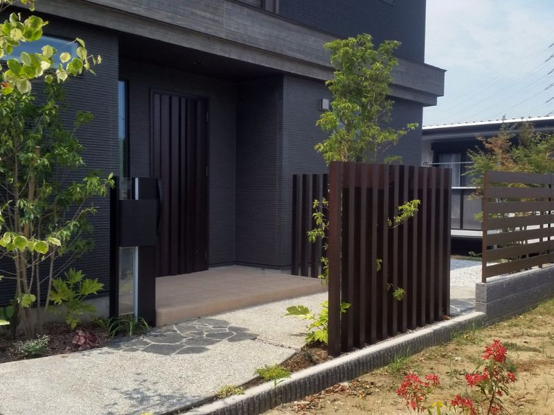 施工事例 WORKS カテゴリー お庭工事 外構・門まわり デッキ・フェンス 花しごと 緑のしごと バラメンテナンス No.g029 木漏れ日がつなぐ二世帯外構 横浜市 外構・門まわり ふたつの玄関をつなぐ外構プラン 世帯1の玄関まわり 世帯2の玄関まわり 奥行とリズムを感じる植栽計画 季節を感じられる庭木をセレクト ブラックをベースとした外観デザインの二世帯住宅の外構をデザインしました。 開放感がありつつもポイントで柱立てを設置してプライバシーを確保し、 二世帯の玄関を繋げるように配置した植栽がモダンな建物をぐっと引き立てています。 Before Afterビフォーアフター 建物を引き立てる外構デザイン ふたつの玄関を繋ぐようリズミカルに植栽を配置。外観デザインとコーディネートしたダークウッド色の柱立てや機能ポールもよく馴染み、建物を引き立てています。 Before ▲ After 施工事例一覧を見る ▲BACK NEXT▲