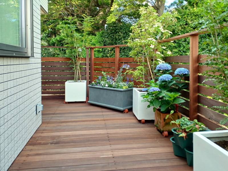 ウッドデッキには水場がない為、お手入れのしやすい植物と大型プランターをセレクト。リビングからも緑を眺められると好評です。