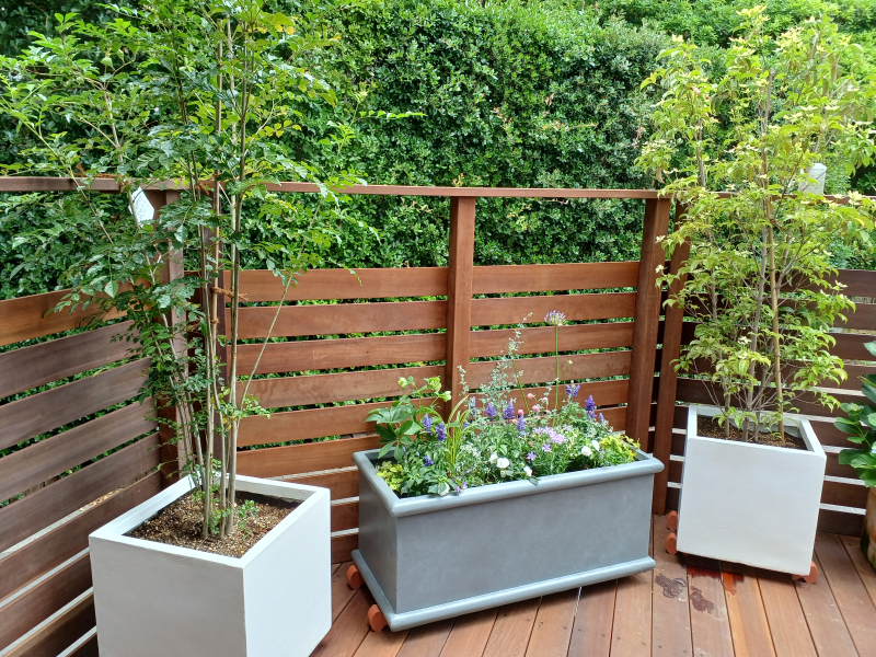 フェンス+植物で程よく視線を遮りプライバシーを確保。家族が安心してくつろげる空間ができました。